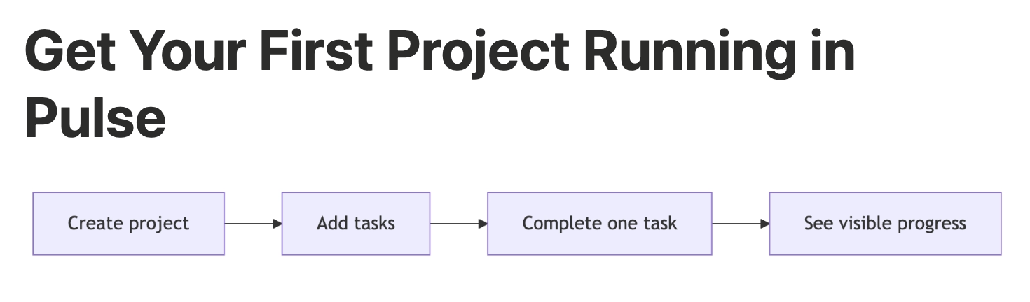 The documentation walks users through creating a project, adding real tasks, and completing their first unit of work to establish momentum and early product value.