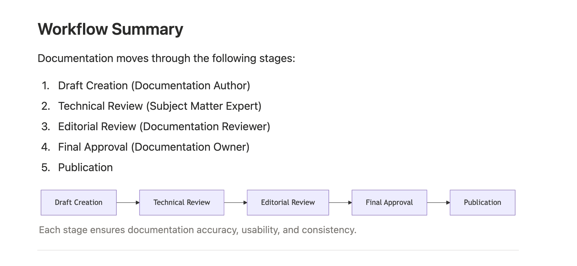 The guide establishes clear responsibilities for authors, reviewers, and documentation owners while defining review stages, approval checkpoints, and publishing standards.
